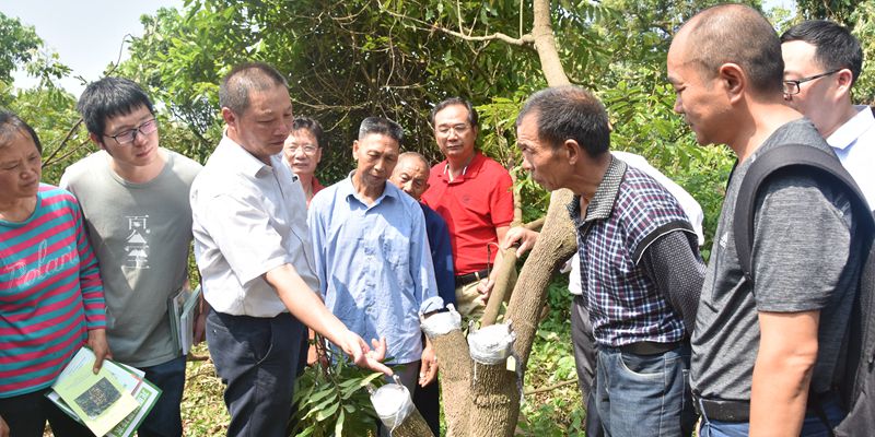 在龙眼、荔枝基地考察现场,专家学者们在田间地头向村民们传授知识经验,讲解龙眼、荔枝的种植、防护措施,以及如何施肥、如何选取优秀枝条嫁接等。“龙眼荔枝嫁接的最好月份是三到五月”,国家荔枝龙眼产业技术体系龙眼栽培岗位专家潘介春向村民讲授栽培知识,他还现场示范教学如何削减枝丫、如何缠薄膜,讲解嫁接后如何防治害虫。华南农业大学园艺学院院长、国家荔枝龙眼产业技术体系首席科学家陈厚彬手把手教当地果农如何修剪枝条,国家荔枝龙眼产业技术体系钦州实验站站长李云昌指点如何播撒农药......