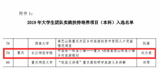 近日,国家文化和旅游部公布了“2019年大学生团队实践扶持培养项目”名单,我校管理学院学生刘力裴、高飞、毛淋、熊秀红、杨丽芬、杨玲、熊宗月参与,刘军林老师指导的“中国第一榨菜小镇——重庆涪陵葛亮山榨菜小镇乡村旅游规划”项目成功入选。