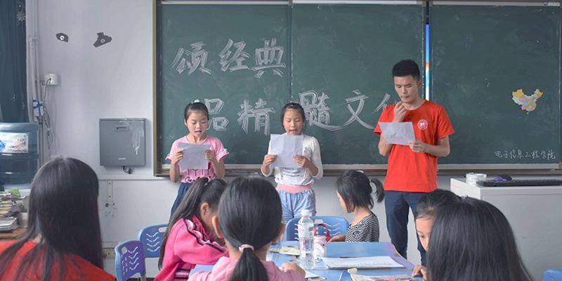 电子信息工程学院“萤火虫之家”志愿者服务团到达建新社区大山小学开展以“诵经典 品精髓文化”为主题的朗诵活动。志愿者逐字逐句地教小朋友们认读诗句,讲述诗里的故事帮助孩子们理解诗句,并结合肢体语言将诗中蕴含的情感生动地展现出来,一时间教室内“诗香”萦绕。