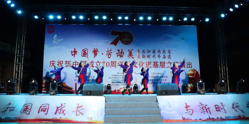 音乐学院2019年暑期“三下乡”文化艺术交流服务团来到武隆区体育馆,以庆祝新中国成立70周年为契机,依托自身专业特点,通过开展文艺演出、社会调研、国家资助政策宣传等活动,与武隆区总工会共同开展送演出进基层活动,并对群众文艺娱乐活动在当地开展状况进行实地调研等。现场演出内容包括独唱、重唱、器乐合奏、舞蹈、诗歌朗诵等,吸引了千余名群众观看演出。