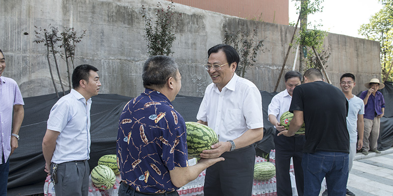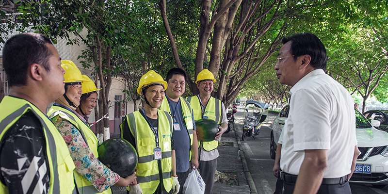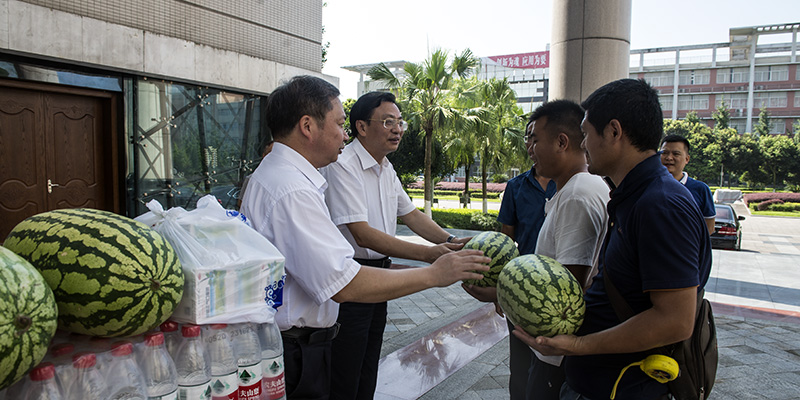 8月2日上午,学校党委书记彭寿清、校长黄大勇、副校长袁革率领党政办公室、党委宣传部、校园建设处、国有资产管理处、后勤管理处等多个职能部门负责人,前往学生宿舍、实验中心、格理楼、聚仕兰庭小区等地的建设工地,看望并慰问冒着酷暑在现场施工的工人,给他们送去清凉消暑的西瓜、矿泉水和防暑药,对他们的辛勤付出表示慰问。