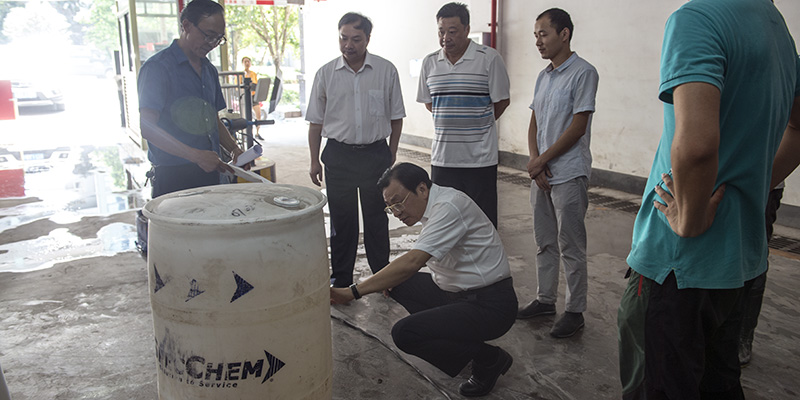 在聚仕兰庭教职工小区地下车库,彭书记巡视了地坪涂装工程的实施情况,在送去慰问品的同时与施工方亲切交谈。彭书记还细致地检视了涂装的材料,询问了相关的性能数据。