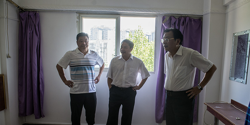 慰问的最后一站来到了校外租用学生宿舍改造工程现场,彭书记查看了A栋、C栋的建设情况。彭书记与施工方交谈时候,希望他们要像建设自己孩子的住处一样建好学生宿舍,给孩子们提供好的学习生活条件。