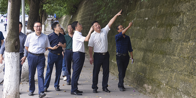 在弘毅体育馆外堡坎处,蔡校长一行查看了沉降地段,详细了解沉降情况。蔡校长提到,秋季雨水多,相关部门负责人要加强对沉降地段的勘测、了解实况,根据观测成像情况,对比多项方案后提出解决措施。