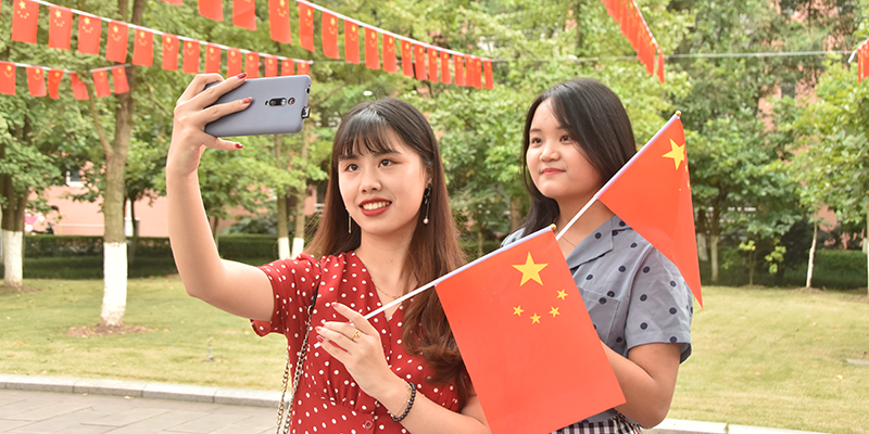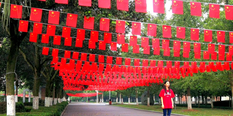 正心楼、诚意楼前悬挂着鲜艳的国旗,形成色彩鲜明的红旗大道,吸引不少学子前往与国旗合影留念。