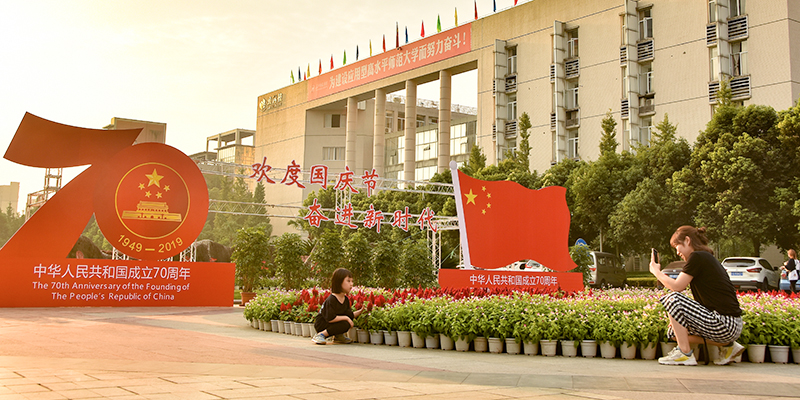 在全国人民热烈庆祝中华人民共和国成立七十周年之际,学校相关职能部门在校门、教学楼宇、学生社区、宿舍板报等地精心布置,营造隆重、热烈的国庆氛围。洋溢着节日气氛的校园,满怀民族自豪感的师生,长师全体师生以饱满的精神面貌献礼新中国七十华诞。