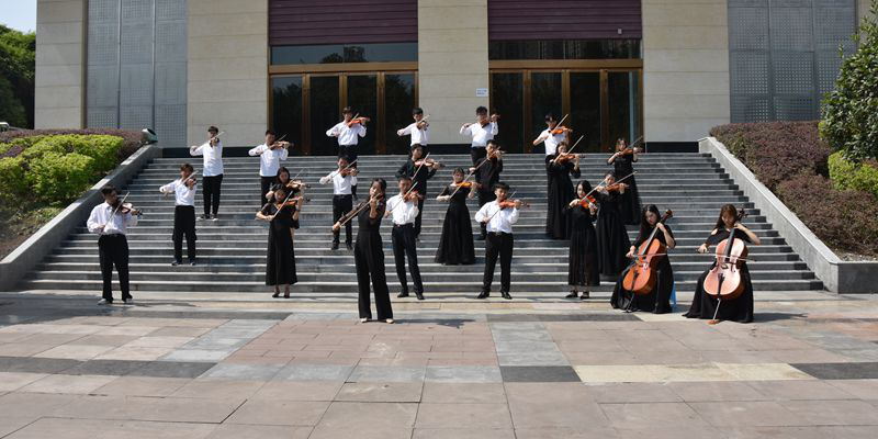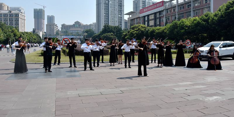 9月29日中午,音乐学院弦乐团23名师生在学校天一广场、音乐厅前开展“我和我的祖国”主题“快闪”活动,弦乐团的同学们用小提琴、中提琴、大提琴合奏歌曲《我和我的祖国》,用音乐献礼新中国七十周年华诞。“快闪”吸引了大批学子参与,齐声歌唱《我和我的祖国》。