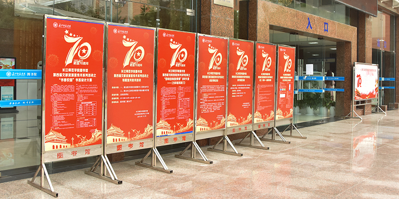 图书馆摆放了庆祝新中国成立七十周年文化展板,展出图书馆为庆祝新中国成立七十周年安排的系列主题活动,吸引学校师生积极参与主题活动。