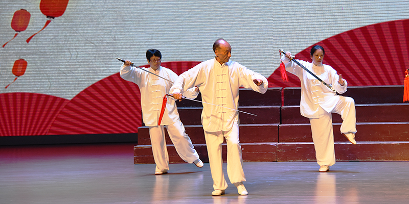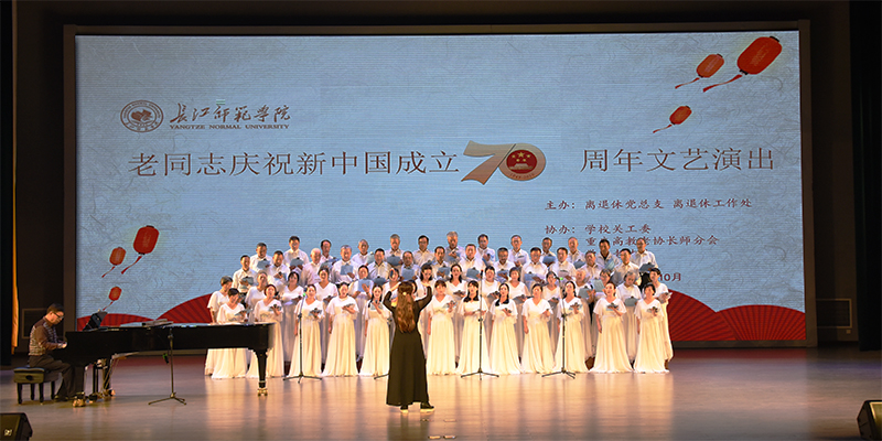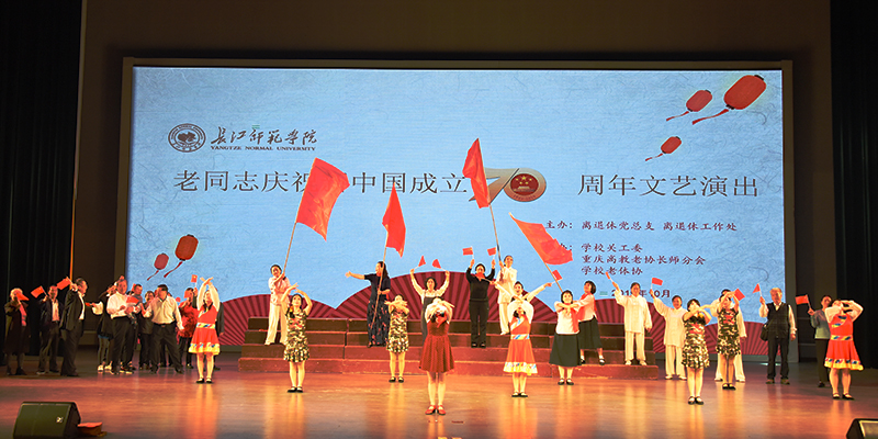 会议最后,由离退休党总支、离退休工作处共同主办,学校关工委、重庆高教老协长师分会、学校老体协联合协办的老同志庆祝新中国成立70周年文艺演出顺利举行,为在场的老领导、老同志送上了浓浓的节日祝福。离退休老教师们以合唱、歌舞、武术等形式,为新中国成立70周年送上满腔的热情与美好的祝福。退休职工合唱团高唱《向往》以及《我和我的祖国》,他们用昂扬向上的歌声赞颂祖国,组舞《绣红旗》《红梅赞》体现了老一辈革命人士捍卫国旗尊严的凛然正气。
