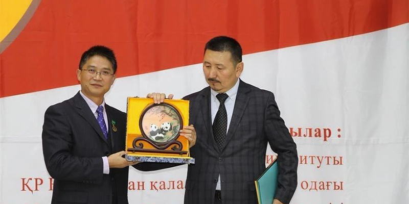 我校傅小彪教授向努尔苏丹市“理想之路”文化友好协会赠送礼品。