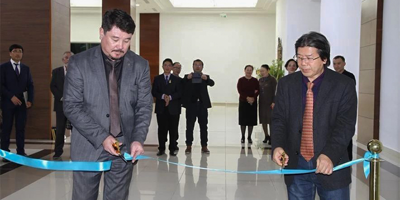 努尔苏丹市美术家协会主席斯麦里沃夫•乌穆尔别克与我校杨贤艺教授为展览剪彩
