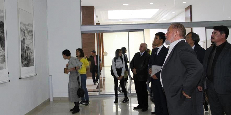 开幕会上,中国驻哈萨克斯坦大使馆文化参赞孙长栋,哈萨克斯坦共和国美术家协会主席朱班尼雅孜沃夫•乌穆尔别克,努尔苏丹市独立宫展览馆长阿布哈衣尔欧娃•阿依努尔,努尔苏丹市“理想之路”文化友好协会主席阿曼•杜曼,努尔苏丹市美术家协会主席斯麦里沃夫•乌穆尔别克等出席仪式。努尔苏丹市美术家协会主席斯麦里沃夫•乌穆尔别克向我校参展画家代表傅小彪等赠送参展证书,并赠送我校美术学院一套精美画册。努尔苏丹市独立宫展览馆馆长阿布哈衣尔欧娃•阿依努尔向我校参展画家杨贤艺等赠送致谢奖牌。