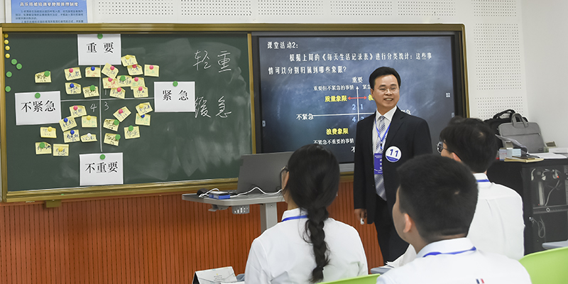 文科中年组比赛中,我校文军老师为学生带来《大学生时间管理课》的职业规划课程。为了让同学们理解重要与紧急模式,掌握时间管理的象限法,文军老师让学生通过演绎情景剧的方式,了解事情的轻重缓急,增强时间管理的意识。