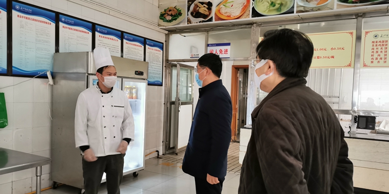 在学生食堂,蔡校长一行认真查看了菜品、后厨等,问询了食堂消毒防疫的情况。蔡校长指出,食堂的正常运转为留校师生提供了用餐保障,这离不开坚守岗位、辛勤付出的工作人员。他强调,食堂一定要做好消毒工作,注意生熟食的制作,同时要思考开学后的工作预案,保障师生的用餐安全。