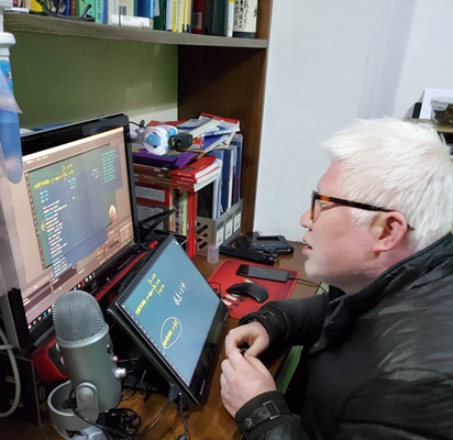谈及网络直播课程经验时,杨世显说到,网络直播课程有别于线下教学,老师们首先应多增加引导性思维的内容讲授,课前确定上课的形式与内容再备课,线上直播时要引导学生自主思考,课堂互动要有度、有效组织。杨老师还认为,直播设备要“不凑合”,为了保证直播课程的顺利与流畅,他在书房开辟了固定区域作为“直播间”,并配有专业的直播设备、收音设备和绿色幕布,让学生们听课时更加高效和专注。