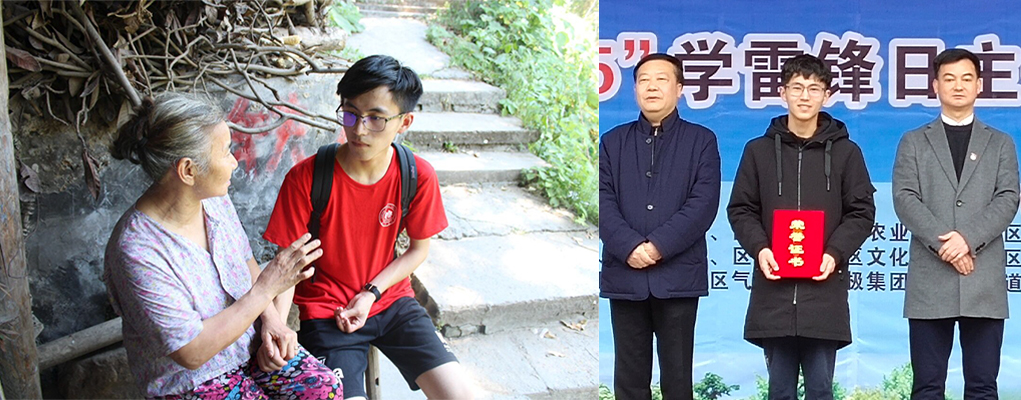 左图为张峻豪大二参加志愿活动,右图为张峻豪(右中)大三上台领奖