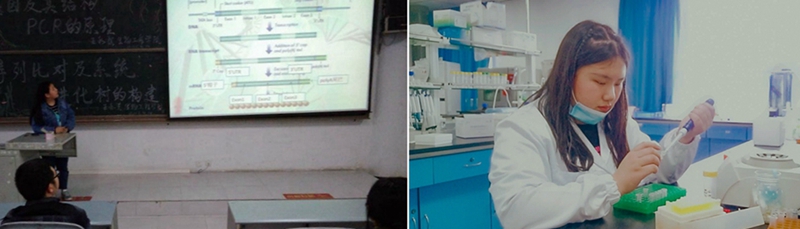 左图为王秋霞大二进行项目汇报,右图为王秋霞大四在做实验