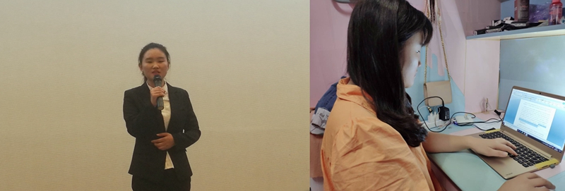左图为吴久艳大二参加竞赛答辩,右图为吴久艳大四在寝室学习