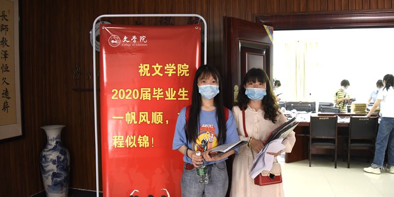 离校在即,文学院毕业生前往老师办公室道别,为老师送去鲜花,感谢老师的悉心栽培,并在学院准备的寄语展板前合影。