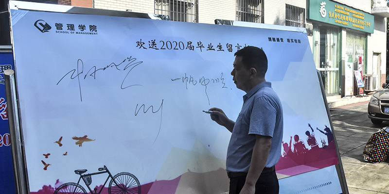 管理学院门口,设置了毕业展架,毕业生与老师在留言板上签字留念,“一帆风顺”承载着老师对毕业生的祝福,老师们用质朴的语言、深厚的感情表达了对学生的不舍与期许。