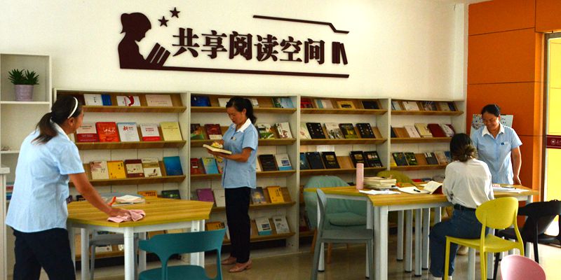 校团委青年志愿者服务团的志愿者们正在清理图书,打扫图书馆。