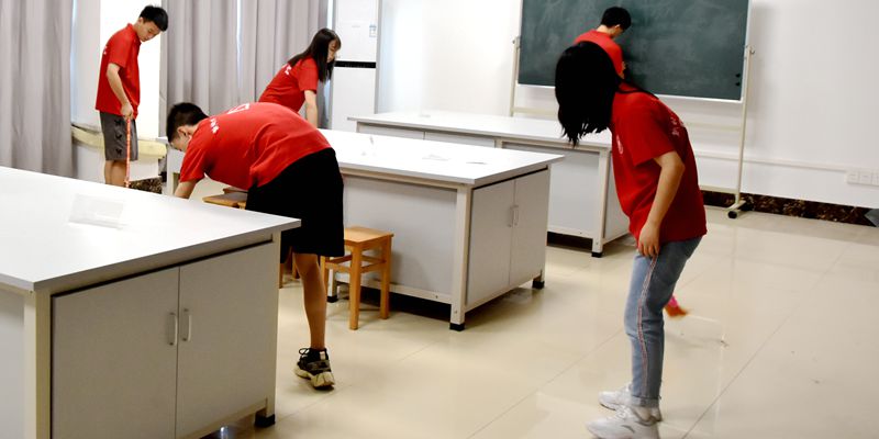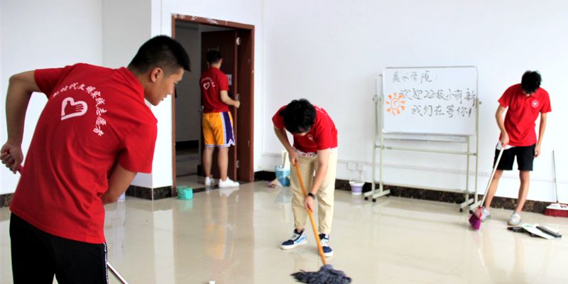 化学化工学院学生预备党员、入党积极分子在新生宿舍、卫生责任公区和实验室开展卫生清扫活动,该院教师队伍也主动参与到本次活动,全院师生共同为新生的到来营造良好环境。