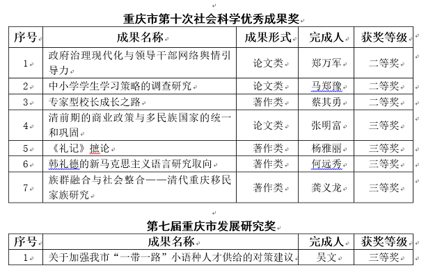 重庆市第十次社会科学优秀成果奖、第七届重庆市发展研究奖评审结果揭晓。全市共评选出150项社会科学优秀成果奖、50项重庆市发展研究奖,我校共有8项成果获奖,其中第十次社会科学优秀成果二等奖3项、三等奖4项;第七届重庆市发展研究三等奖1项,获奖数量在市属本科院校中居于前列,创造历史最好成绩。