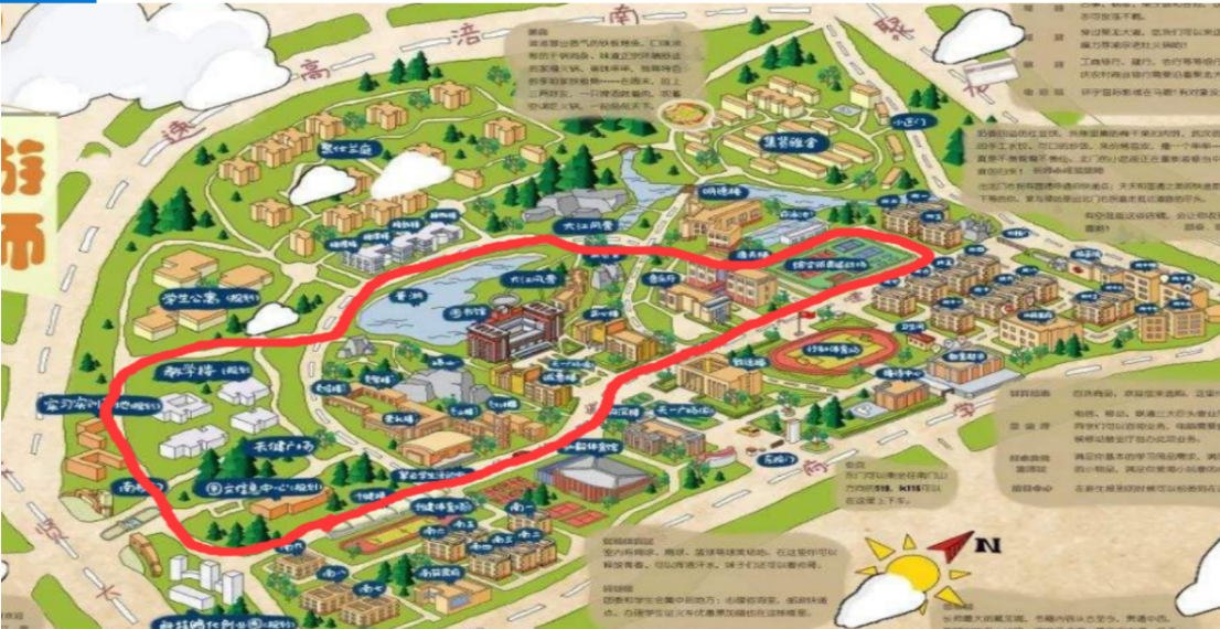 行健体育场集合出发,校园内环跑3公里左右,终点回到行健体育场。