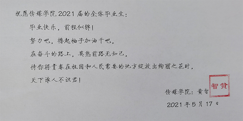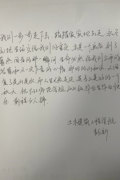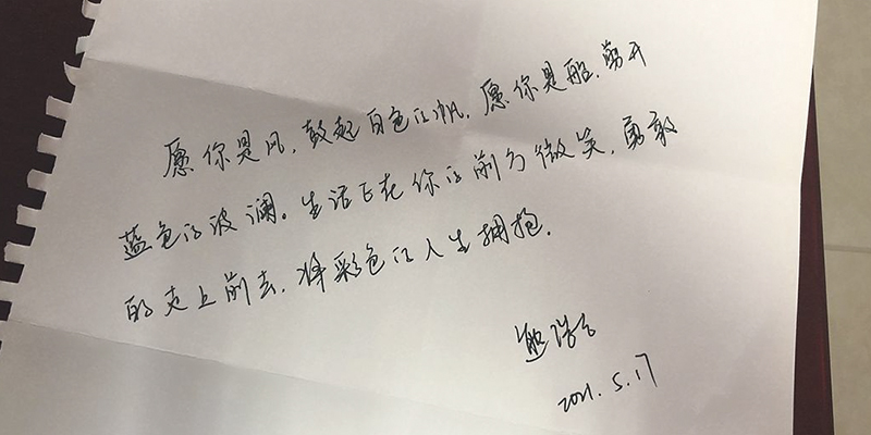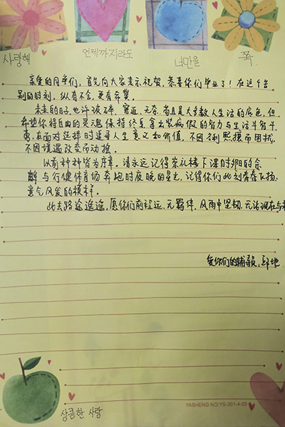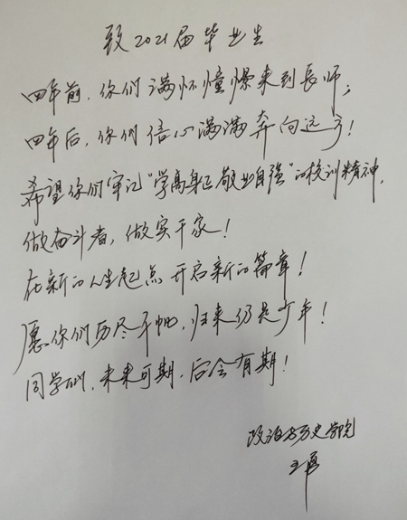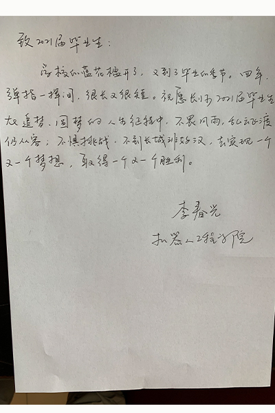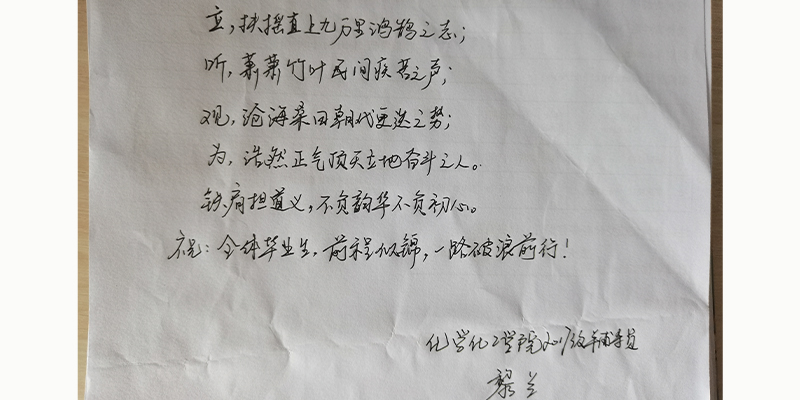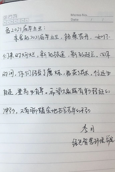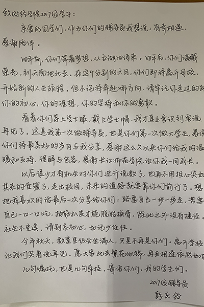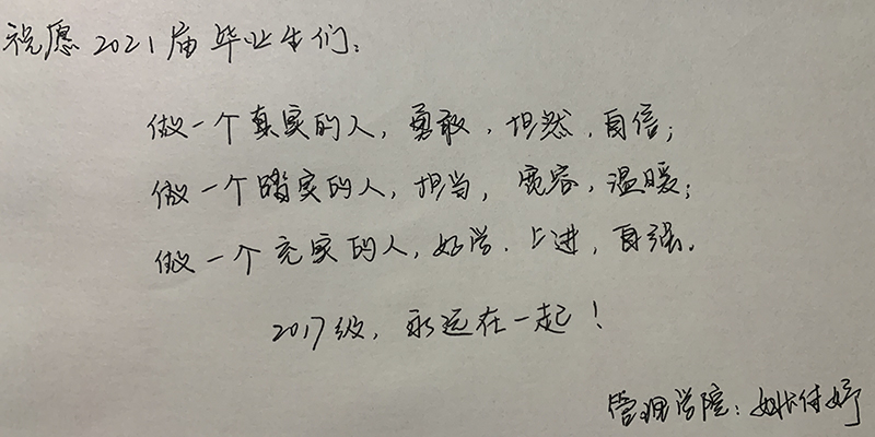 2017年的9月,带着憧憬与迷惘来到大学的少年,经过四年的拼搏与沉淀,转眼就到了离开校园的时刻。四年里,辅导员用爱陪伴着每一位学子成长、成熟,倾注了无数心血,在平凡的岗位上培育优秀人才。孩子们即将展翅翱翔,2017级辅导员们亲笔书写离别祝福,把殷殷嘱托置于字字句句,把深情抒于字里行间。