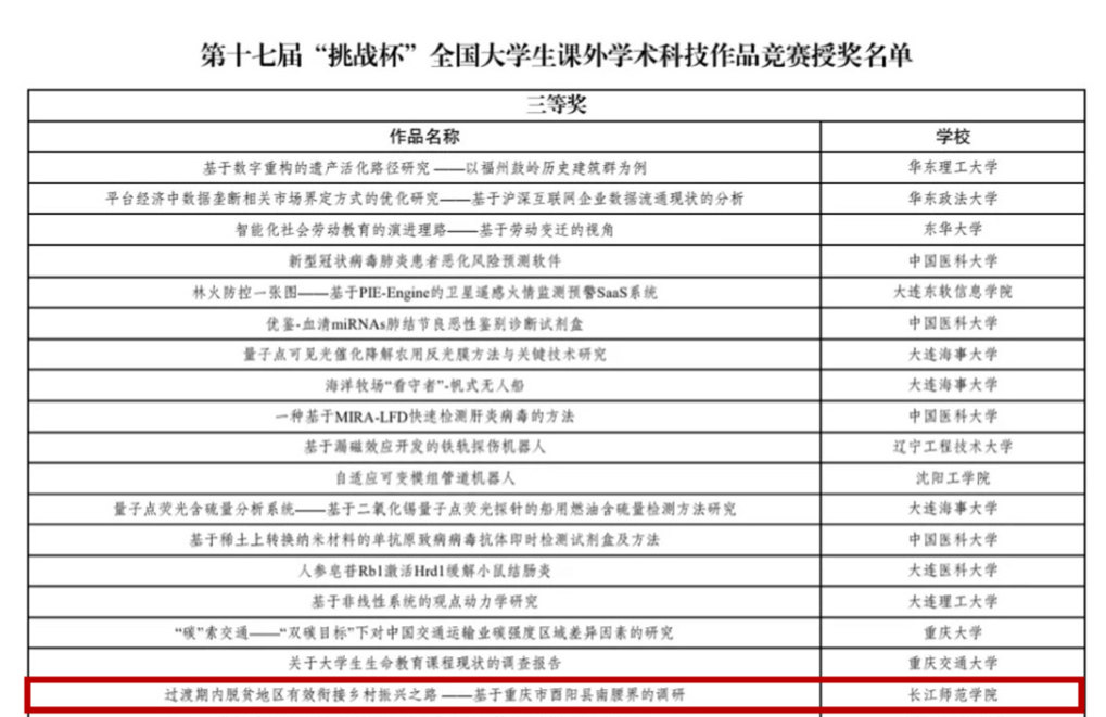 近日,由共青团中央、中国科协、教育部、中国社会科学院、全国学联和地方省级政府共同主办的第十七届“挑战杯”全国大学生课外学术科技作品竞赛授奖名单公布。我校管理学院学生杨珊作品《过渡期内脱贫地区有效衔接乡村振兴之路——基于重庆市酉阳县南腰界的调研》(指导老师:谭明交、罗文宝)荣获全国三等奖。