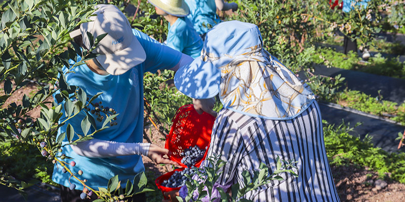 “今年蓝莓大丰收,我们根本忙不过来,多亏了你们这些志愿者们来帮忙呀!”中益乡蓝莓园农户感叹道。一大早,志愿者们便起床,头戴草帽,手提采摘篮,帮助当地蓝莓种植户集体采摘蓝莓。顶着烈日,志愿者们辛勤地穿梭在蓝莓庄园田里,在乡亲们的带领下渐渐熟悉采摘工作,一上午就收获了满满几十筐蓝莓。经过分装、称重、打包,志愿者们将采摘的三百余斤新鲜蓝莓包装成了一盒盒精致的蓝莓礼盒,并且将很快销往各地供消费者购买。志愿者骆小倩感叹道:“新农村特色农业产业发展迅速,感谢国家的政策帮扶,让农村焕发了新的活力。”