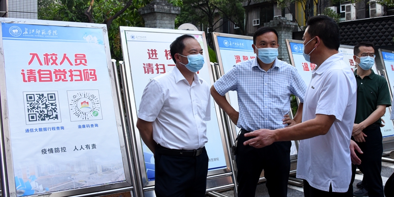 9月7日下午,党委书记黄大勇,副校长袁革、李柳柏,纪委书记赵骏带队检查疫情防控工作。党政办公室、学生工作处、安全管理处、基建后勤处、金科物业、新大正物业等机构负责人陪同检查。