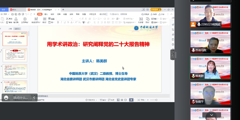 会议分为专家领学、教师分享、院长点评和大会总结四个阶段。领学阶段,特邀巴渝学者、中国地质大学(武汉)二级教授、博士生导师韩美群作了题为《用学术讲政治:研究阐释党的二十大报告精神》的发言,从学术视角阐释党的二十大报告的战略意义、主要内容、重要创新、总特点与总要求。