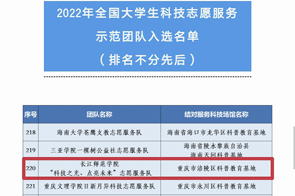 日前,团中央青年志愿者行动指导中心、中国青年志愿者协会秘书处联合中国科学技术协会面向全国征集遴选300支全国大学生科技志愿服务示范团队,我校政治与历史学院“科技之光、点亮未来”志愿服务队成功入选。