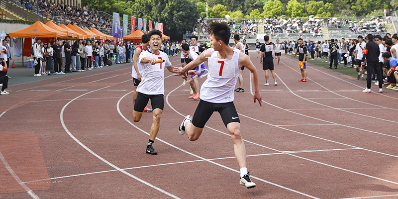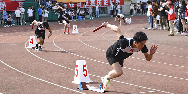 在4×100、4x400的接力赛道上,各学院的运动员奋力拼搏、激烈角逐,接力棒不断交递,传递出长师人自强不息、所向披靡的体育精神。在一阵阵的呐喊声中,接力赛跑将整个运动会推向高潮。裁判员凝神专注场上赛况,有力发号施令;志愿者积极维护比赛秩序,往返赛场做好各项后勤工作;医疗保障人员驻守赛场医疗点,时刻待命;主持人追踪播报比赛进程,热情洋溢地宣读着各学院撰写的加油稿,行健体育场热闹非凡。