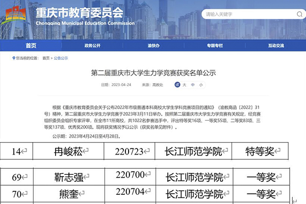 日前,第二届重庆市大学生力学竞赛成功举办。本届竞赛共吸引了全市11所高校的1022名学生参加,经专家评审,我校土木建筑工程学院学子荣获特等奖1项、一等奖2项、三等奖7项,取得了我校在该项竞赛中最好的成绩。