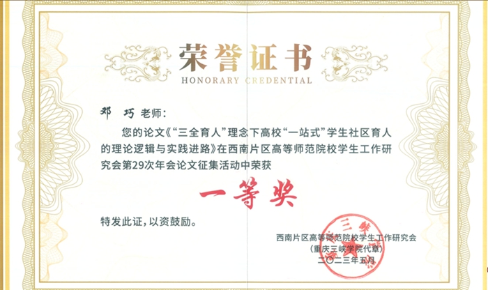 会上,我校教师围绕“高校思想政治教育工作、提高人才培养质量、构建新时代学生工作体系”等主题作交流分享。会议还评选了优秀学生工作研究论文,经过严格评定,我校教师提交的论文荣获一等奖1篇、二等奖2篇、三等奖3篇、优秀奖7篇,获奖总数位居参会高校第三名。其中,外国语学院辅导员邓巧撰写的论文《“三全育人”理念下高校“一站式”学生社区育人的理论逻辑与实践进路》荣获一等奖。
