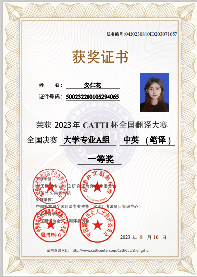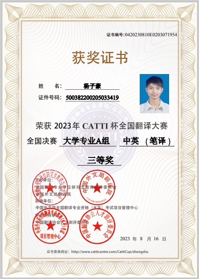 日前,2023年“CATTI杯”全国翻译大赛落下帷幕。我校外国语学院5名学子进入全国总决赛的角逐,经过多轮比拼,安仁花同学摘得全国总决赛一等奖,杨子豪同学荣获三等奖。