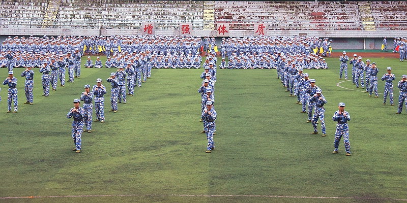 擒敌拳方阵、手势操方阵、匕首操方阵先后展示了摔擒、武术、格斗、战术等内容,同学们坚定的目光、热血的嘶吼、整齐的动作,饱含着军训14天以来的汗水与成长,展现了长师学子朝气蓬勃、奋发向上的精神风貌。