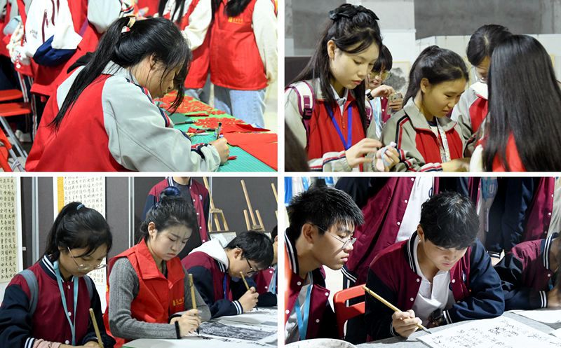 在美术学院,大家津津有味地欣赏画展,亲自创作剪纸、书法作品。同学们时走时停,品味山水画之浑然天成、人物画之气韵生动,体验剪纸的玲珑剔透、万剪不断,纷纷端坐于桌前,静气凝神临摹名帖,在翰墨书香中体味点画劲挺、笔力凝聚、欹侧险峻。