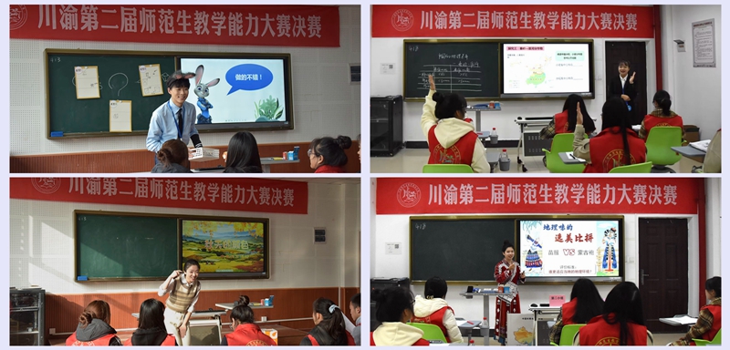 本次决赛包括教学设计、课件制作、即席讲演、模拟授课板书、现场答辩五个环节。参赛选手以生动有趣的现场教学、完善的教学设计、颇具创意的板书,接次呈现了一堂堂丰富生动的课堂教学,充分展示了川渝师范生良好的教学技能及训练成果。