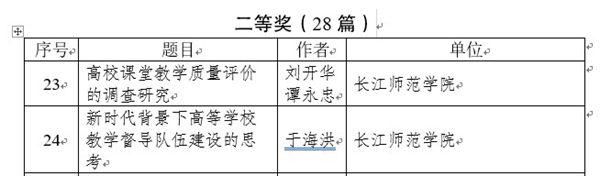 自评选活动启动,我校党委高度重视,教学质量监测研究与评估中心积极落实、广泛宣传、精心谋划,研究论文《高校课堂教学质量评价的调查研究》《新时代背景下高等学校教学督导队伍建设的思考》获评二等奖、《地方高校教学督导工作的痛点、堵点与疏点》获评三等奖。