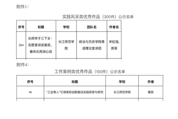 近日,教育部中国大学生在线公布了“大我青春”2023暑期社会实践成果征集展示活动的推选结果。我校政治与历史学院“青语”理论宣讲团提交的《长师学子三下乡:志愿宣讲进基层,春风化雨润心田》入选实践风采类优秀作品,数学与统计学院姜丽老师提交的《“三全育人”引领高校创新路径实践探索与研究》入选工作案例类优秀作品。