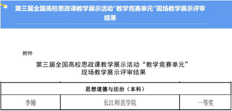 近日,教育部办公厅公示了第三届全国高校思想政治理论课教学展示活动“教学竞赛单元”评审结果,我校马克思主义学院教师李嫚荣获《思想道德与法治》课(本科)一等奖。