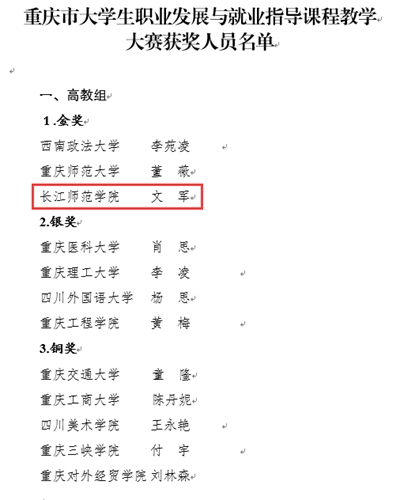 日前,重庆市教委公布了全市大学生职业发展与就业指导课程教学大赛结果,共评选出金奖4名、银奖6名和铜奖10名。我校文军教授主讲的职业规划课程荣获金奖,并将参加全国总决赛。