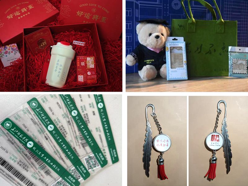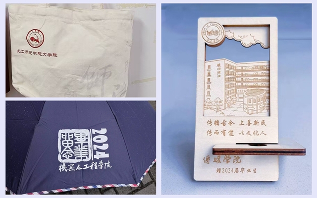 文学院准备的帆布包提醒毕业生们绿色环保、勤俭节约,各种字体的“师”字则叮嘱学子们谨记“师从师出 治学促乡”的办学传统,立志建功新时代;机器人工程学院定制的雨伞印着“2024”“毕业快乐”的字样,祝愿毕业生们不惧风雨,鲲鹏展翅万里行;传媒学院为每位毕业生准备了一套礼物:绿色的纪念帆布袋祝愿长师情、师生情如松柏冬夏常青,里面的专属毛绒小熊印着校徽和院徽,精心绣上了每一个同学的名字,暖暖的,很贴心。还有别致的冰箱贴和手机支架,学校图书馆和格致楼的独特设计元素尽显爱心、细心、贴心。