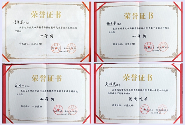 7月2日至4日,第七届重庆市高校青年教师教学竞赛决赛在重庆大学虎溪校区举行。经过三天的激烈角逐,我校教师付翠翠获理科组一等奖、杨竞豪获文科组一等奖、秦明一获工科组二等奖、彭甜媛获思想政治理论课专项组优秀选手,竞赛成绩位居同生态位高校第一。