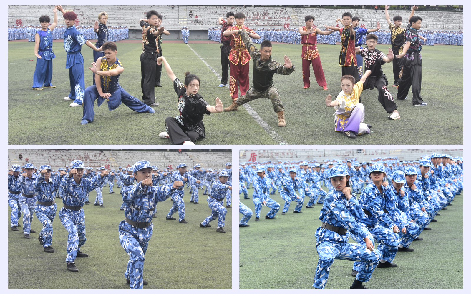 接下来的武术、男生军体拳、女生匕首操特色军事技能表演将大会气氛推向高潮。同学们动作刚劲有力、干净利落,招式标准到位,眼神坚定刚毅,整套动作一气呵成,气势如虹。