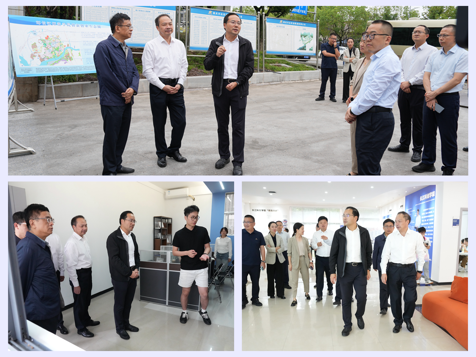 董奕锋一行实地考察了学校实习实训中心建设现场,详细了解工程进度与功能规划;前往长江科创学院,观摩慧谷湖科创实验班教学成果展示,听取了学校关于大学生创新创业项目孵化、科技成果转化等方面的工作介绍。