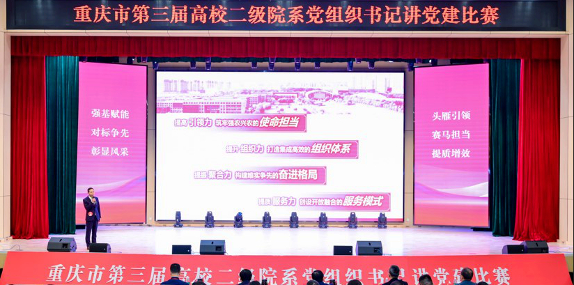 12月4日至5日,重庆市第三届高校二级院系党组织书记讲党建比赛在重庆城市管理职业学院举办,本科院校组共有28所高校二级院系党组织书记参赛。经过激烈角逐,我校现代农业与生物工程学院党委书记汪明松同志荣获本科院校组一等奖。
